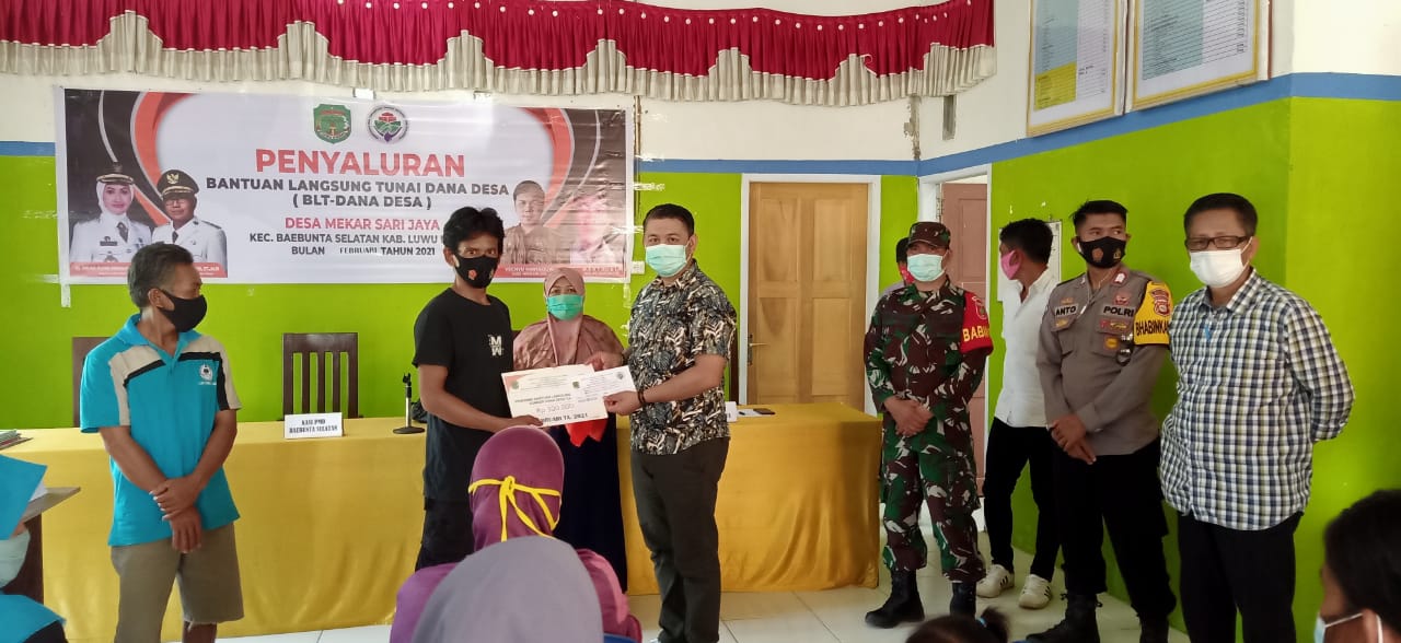 LEPONGAN NEWS, LUTRA – Pemerintah Desa (Pemdes) Mekar Sari Jaya, Kecamat an Baebunta Selatan, Kabupaten Luwu Utara (Lutra) Sulawesi Selatan (Sulsel), menyerahkan Bantuan Langsung Tunai Dana Desa (BLTDes) kepada 62 warga kurang mampu dampak Covid-19 tahun anggaran 2021, di Aula Kantor Desa untuk bulan Maret 2021, belum lama ini.