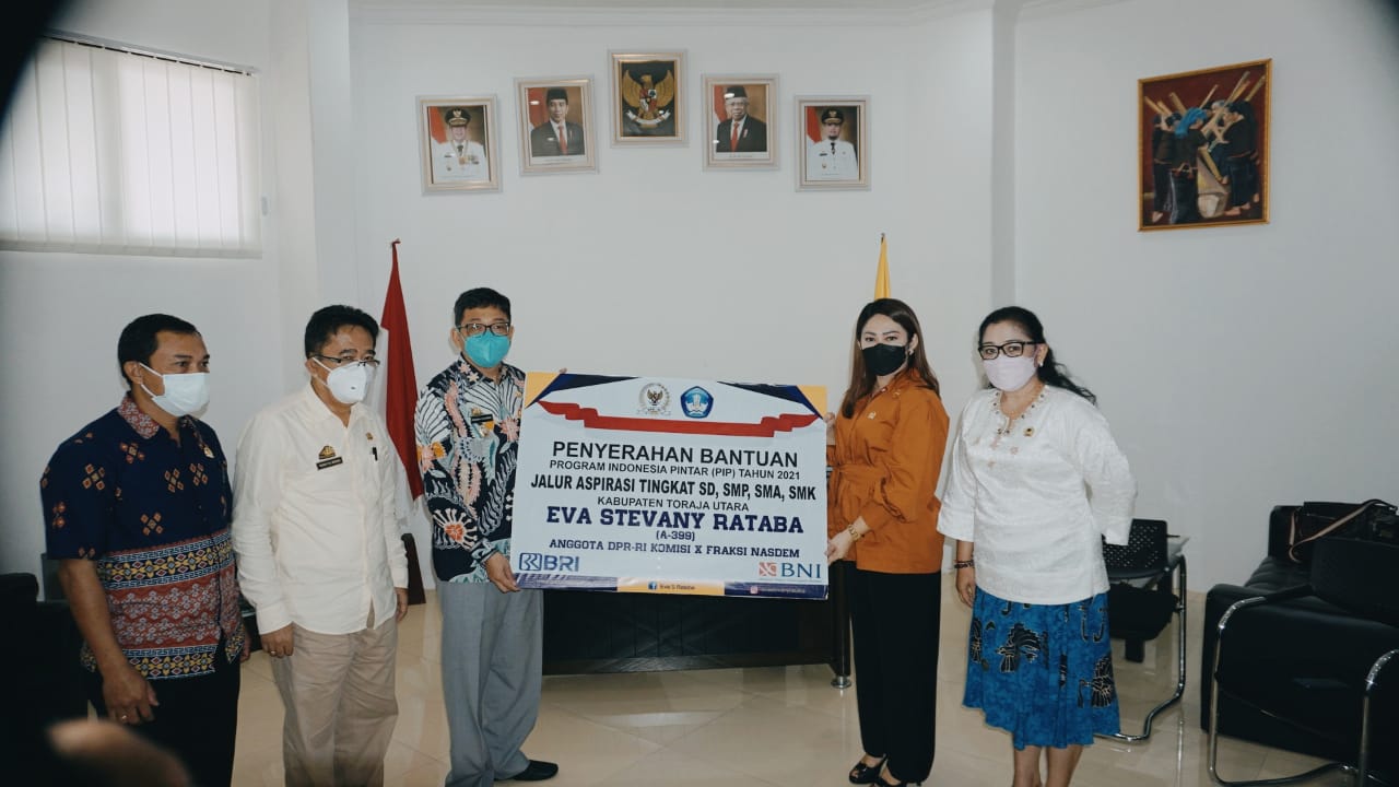 LEPONGAN NEWS –Toraja Utara – Anggota DPR RI dari Fraksi Nasdem yang juga anggota Komisi X DPR RI Eva Stevany Rabata memberikan bantuan Program Indonesia Pintar (PIP) melalui jalur aspirasi kepada Pemerintah Kabupaten Toraja Utara yang diterima secara simbolis oleh Wakil Bupati Toraja Utara, Frederik V. Palimbong, ST, Jumat 30 Juli 2021.