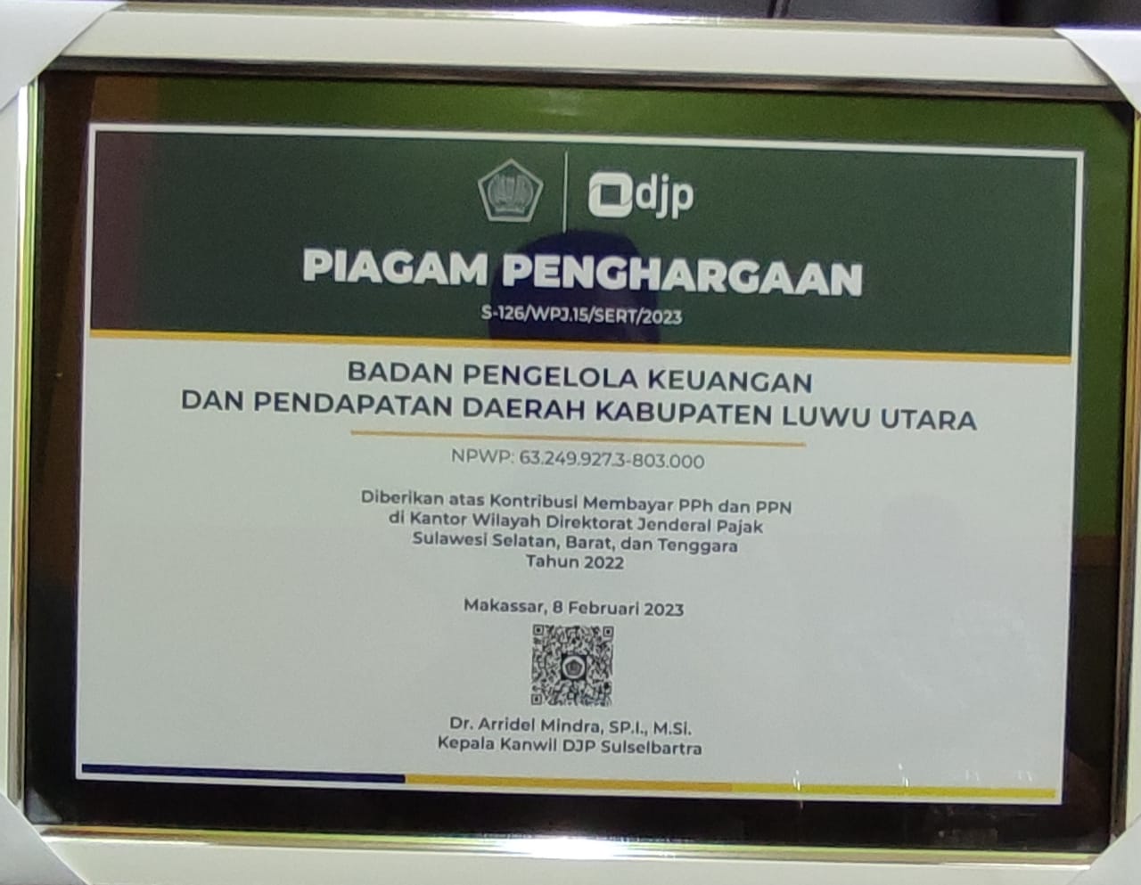 Hal tersebut,” kata Baharuddin Nurdin Kepala BPKPD Luwu Utara (Lutra) pada media ini, Selasa (14/2/2023) bahwa, penghargaan tersebut atas kontribusi tercepat dengan kontribusi besar diwiayah KPP Pratama Kota Palopo,” sebut Baharuddin.