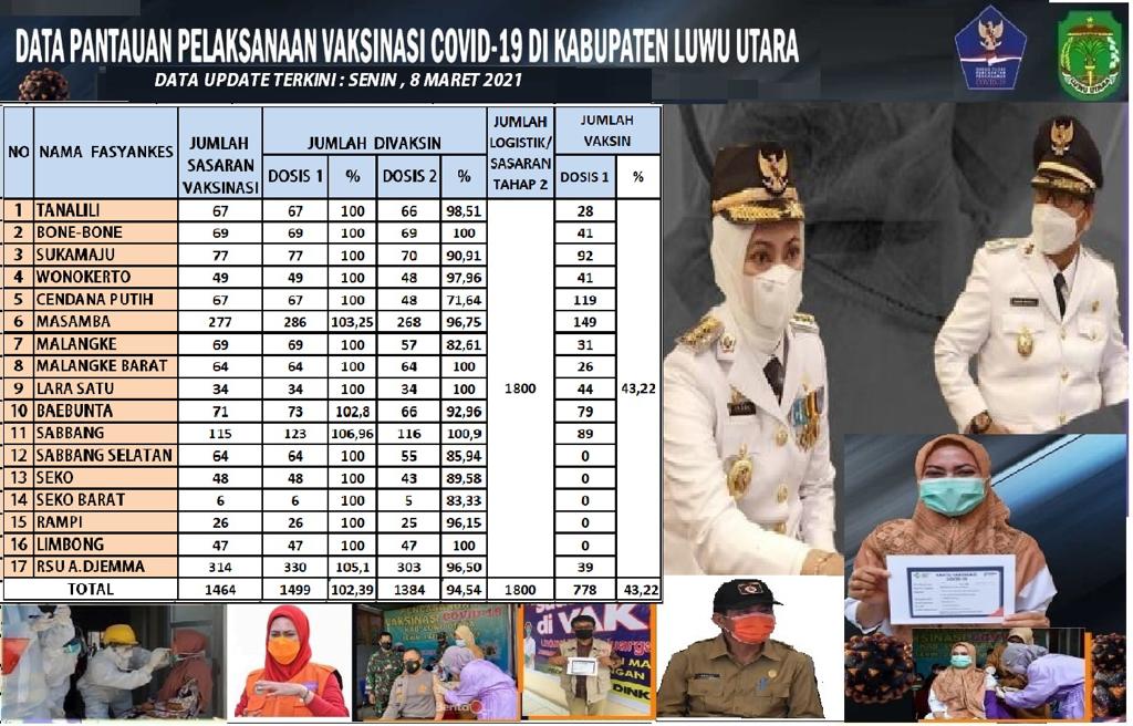 LEPONGANNEWS, LUTRA – Vaksinasi covid-19 tahap 2 (dua) di Kabupaten Luwu Utara (Lutra) Sulawesi Selatan (Sulsel) sudah mencapai 778 orang atau 43,22 persen dari total jumlah sasaran 1800 orang.