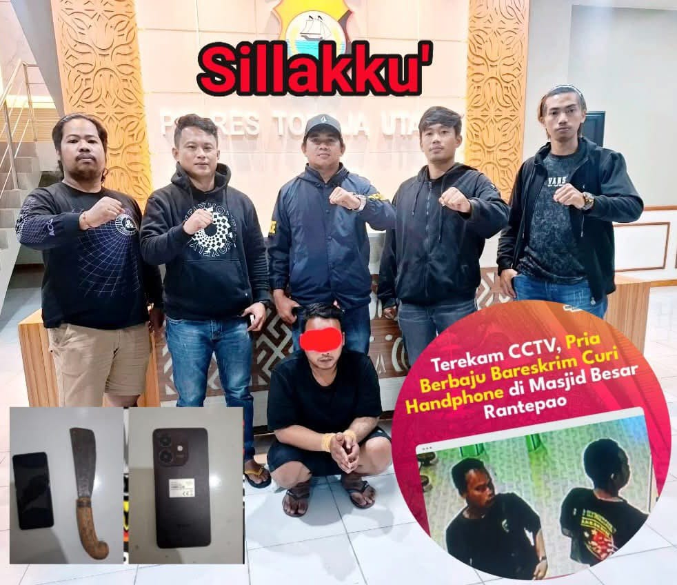 Lepongan News, Rantepao.- Tim Resmob Polres Toraja Utara berhasil mengamankan seorang pria yang diduga pelaku pencurian sebuah Handphone di Masjid Raya (Masjid Agung) Rantepao, Toraja Utara.