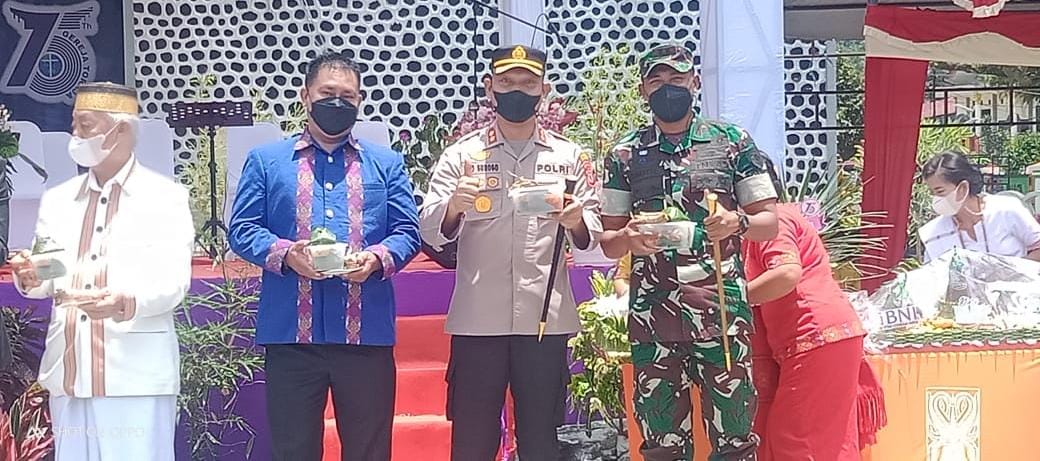 LEPONGANNEWS, TORAJA – Dandim 1414/Tana Toraja Letkol Inf Amril Hairuman Tehupelasury bersama Kapolres Toraja Utara AKBP Eko Suroso menghadiri dan memantau pelaksanaan syukur HUT ke 75 Gereja Protestan Toraja di Rantepao Kabupaten Toraja Utara, Sabtu 26 Maret 2022.