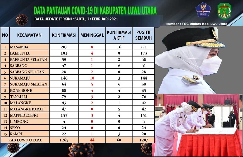 LEPONGANNEWS, LUTRA – Juru Bicara Satuan Tugas Penanganan Covid-19 Luwu Utara I Komang Krisna mengatakan, total keseluruhan angka kasus positif covid-19 di Kabupaten Luwu Utara (Lutra) Sulawesi Selatan (Sulsel) sebanyak 1265 orang pada Sabtu, 27 Februari 2021.