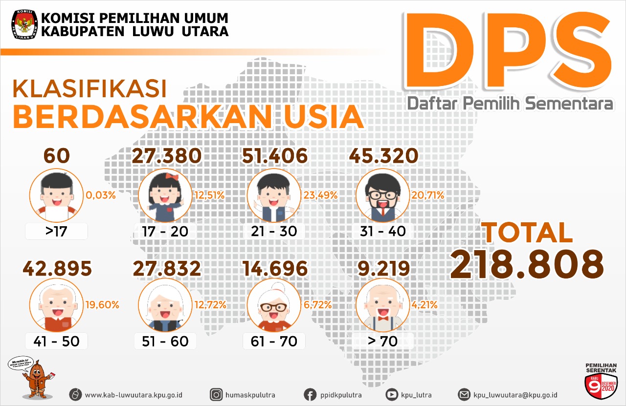 Sekadar diketahui untuk klasifikasi pemilih berdasarkan usia, sambung Asjaya, umur 17 tahun kurang lebih 60 pemilih, umur 17-20 tahun ada 27.380 pemilih, umur 21-30 ada 51.406 pemilih, umur 31-40 ada 45.320 pemilih, umur 41-50 ada 42.895 pemilih, umur 51-60 ada 27.832 pemilih, umur 61-70 ada 14.696 pemilih, umur lebih 70 ada 9.219 pemilih.