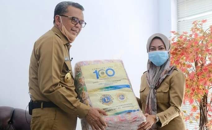 Dalam kunjungan kerja Gubernur Sulsel juga menyerahkan secara simbolis bantuan logistik untuk para pengungsi bencana banjir bandang lumpur dari Lions Club.