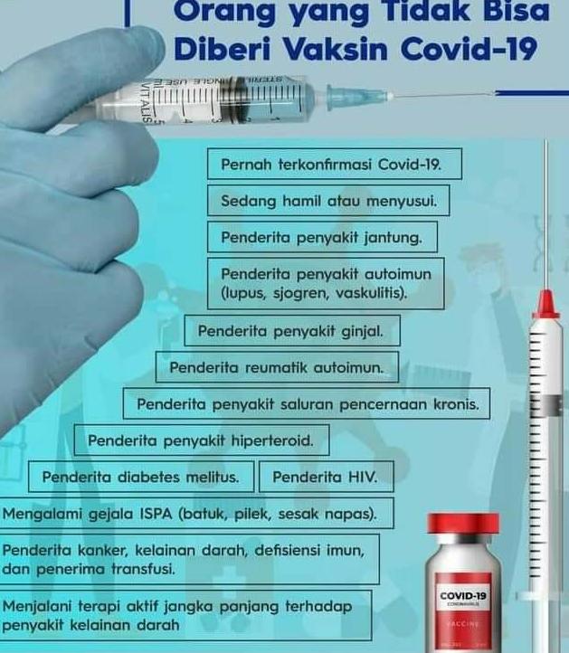 Kriteria orang yang tidak bisa diberi vaksin Covid-19, disebutkan oleh Hairul Muslimin, berdasarkan format screening pada Juknis Vaksin Covid-19 antara lain : Orang yang pernah terkonfirmasi positif Covid-19, Ibu hamil atau menyusui, Orang yang memiliki gejala ISPA seperti batuk, pilek, sesak napas dalam 7 hari terakhir, Orang dengan tekanan darah 140/90 ke atas, Memiliki riwayat alergi, Penderita penyakit jantung, ginjal, reumatik autoimun, penyakit autoimun sistemik seperti lupus, penderita penyakit saluran pencernaan kronis, penderita hipertiroid atau hipotiroid, penderita penyakit kanker dan kelainan darah, serta penderita HIV.