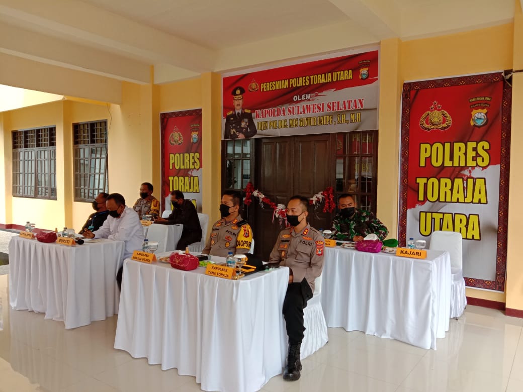Peresmian Polres Toraja Utara sejatinya akan dilaksanakan sesuai dengan SOP lazimnya peresmian berdirinya sebuah kantor polres, namun kondisi pandemik virus corona yang menjadi dasar pertimbangan sehingga acara peresmian tersebut dilangsungkan melalui vicon atau sambungan langsung dari jarak jauh, namun pun demikian tidak mengurangi khidmatnya proses peresmian Polres Toraja Utara oleh Kapolda Sulsel Irjen Pol. Mas Guntur Laupe SH,MH.(AKS)