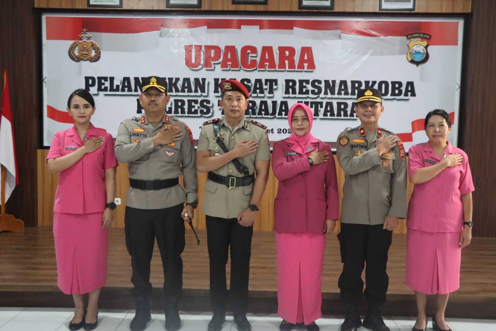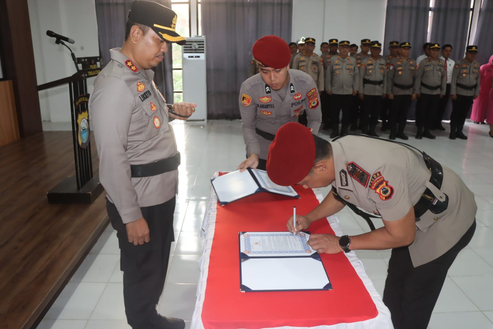 Pelantikan dipimpin langsung oleh Kapolres Toraja Utara, AKBP Stephanus Luckyto A.W, S,I,K., S.H., M.Si, selain Pejabat yang dilantik turut hadir Wakapolres Toraja Utara, para Pejabat Utama, para Perwira dan Bintara, Ketua dan Wakil Ketua Bhayangkari Cabang Toraja Utara, serta para Pengurus Bhayangkari.
