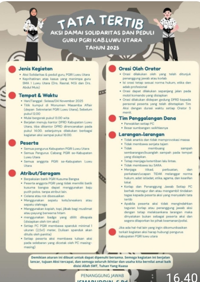 Aksi Solidaritas ini atau Unjuk Rasa ini sebagai wujud Solidaritas dan Soliditas Anggota PGRI karena Guru adalah kaum cendekia yang harus dilindungi sebagai pendidik. Oleh karena itu kami akan turun aksi dalam jumlah besar,” tegas Ismaruddin, Senin (3/11/2025).