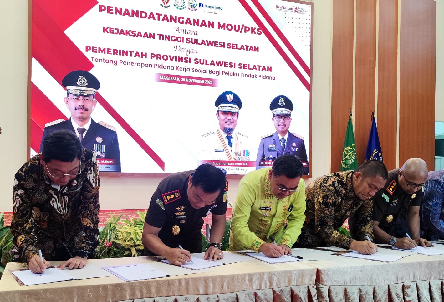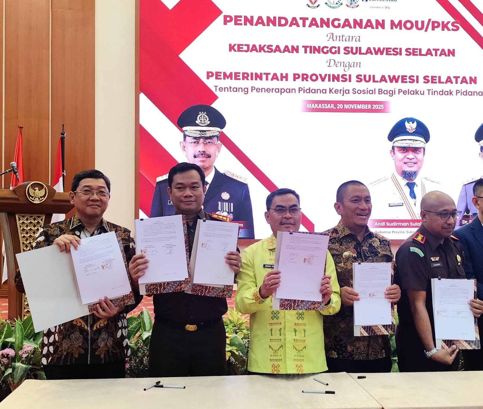 Lepongan News, Makassar.- Menghadirkan keadilan yang lebih humanis di Sulawesi Selatan dengan memasuki fase baru. Pemerintah Provinsi Sulawesi Selatan bersama Kejaksaan Tinggi Sulsel resmi menandatangani nota kesepahaman terkait penerapan pidana kerja sosial bagi pelaku tindak pidana, Kamis (20/11/2025), di Rumah Jabatan Gubernur Sulsel.