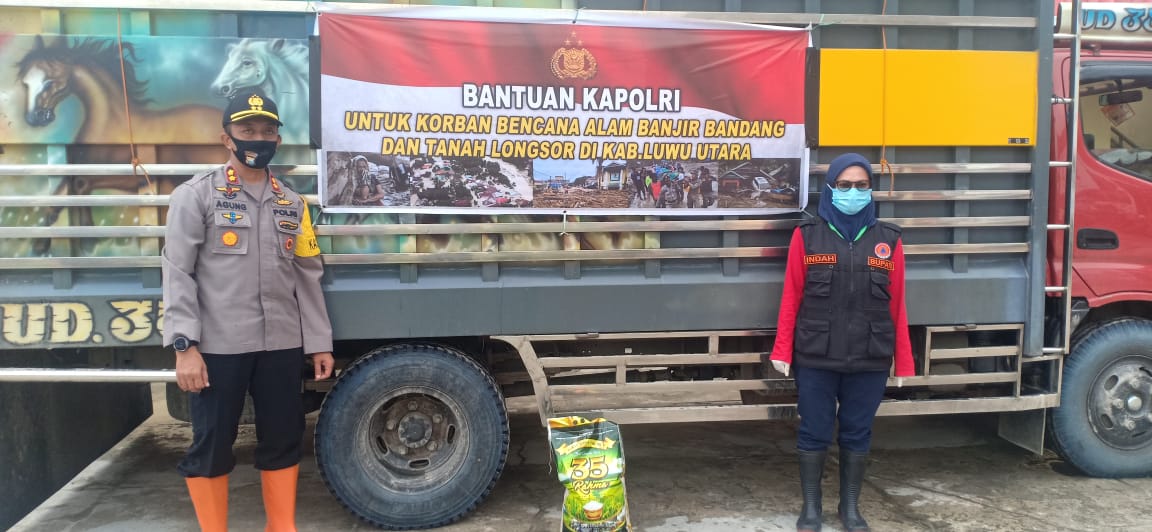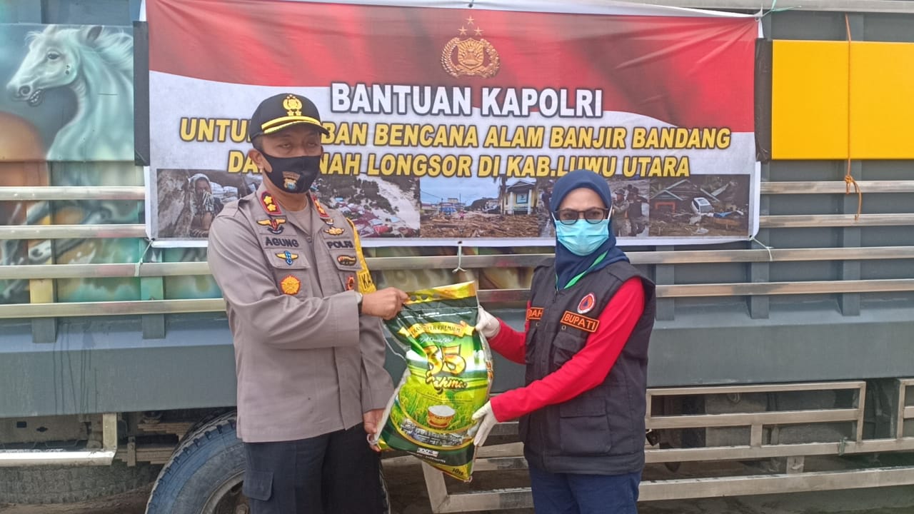 Bupati Lutra, Indah Putri Indriani menerima secara simbolis bàntuan peduli kasih dan empati dari Kapolri melalui Kapolres Luwu Utara. Dan bantuan Kapolri tersebut di bagi ke 23 Posko yang tersebar di wilayah Lutra.
