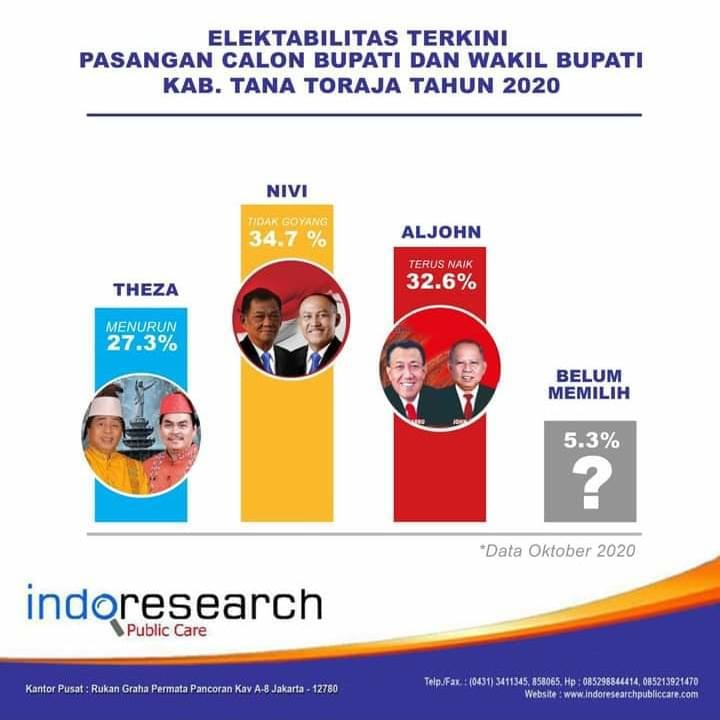 Salah satunya ditunjukkan Indoresearch Publik Care yang menunjukkan hasil polling tertinggi diraih oleh pasangan incumbent, NIVI dan diurutan kedua AL-JOHN dan disusul pasangan THEZA.