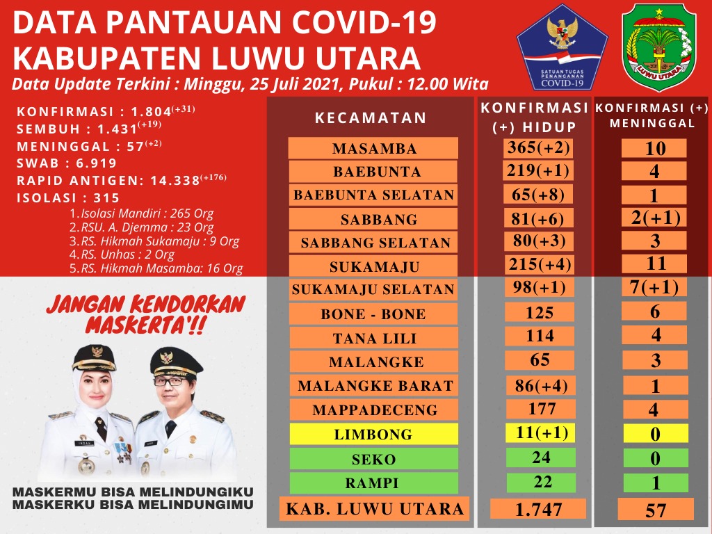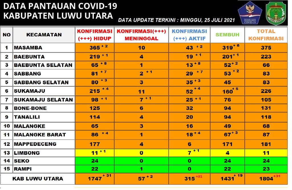 LEPONGANNEWS, LUTRA – Satuan Tugas Percepatan Penanganan Corona Virus Luwu Utara, Juru Bicara (Jubir) I Komang Krisna, SKM, mengupdate tambahan 31 pasien baru yang positif terinfeksi virus corona (Covid-19). Kemudian ada 2 orang meninggal dunia dan 19 dinyatakan sembuh dari Corona per Minggu, 25 Juli 2021.