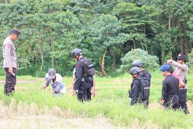 Lepongannews.com-, Toraja – Tim Penjinak Bom (Jibom) Gegana Satuan Brimob Polda Sulsel meledakkan sebuah granat jenis uzo yang ditemukan warga di kolam sawahnya.