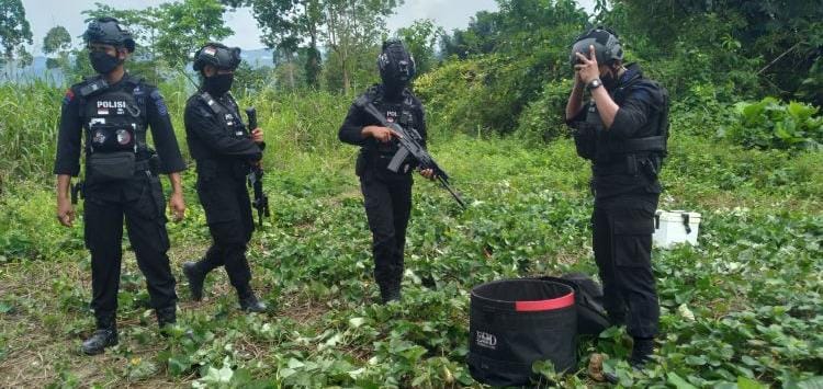 LEPONGANNEWS, LUTRA – Anggota Polres Luwu Utara bersama Tim Jibom Gegana Sat Brimob Polda Sulawesi Selatan (Sulsel) memusnahkan dengan cara meledakkan tidak jauh dari tempat granat nanas yang ditemukan warga Saluampak di Dusun Mari-Mari II Desa Mari-Mari Kecamatan Sabbang Selatan belakang rumahnya Luther atau akrab dipanggil Papa’ Delon.