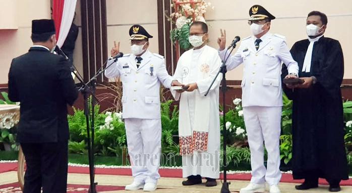 LEPONGANNEWS, SULSEL – Bupati dan Wakil Bupati Toraja Utara (Torut) Sulawesi Selatan (Sulsel) terpilih pada pemilihan kepala daerah serentak tahun 2020, Yohanis Bassang, SE, M.Si-Frederik Victor Palimbong, ST resmi dilantik hari ini dan diambil sumpahnya, Senin, 26 April 2021.